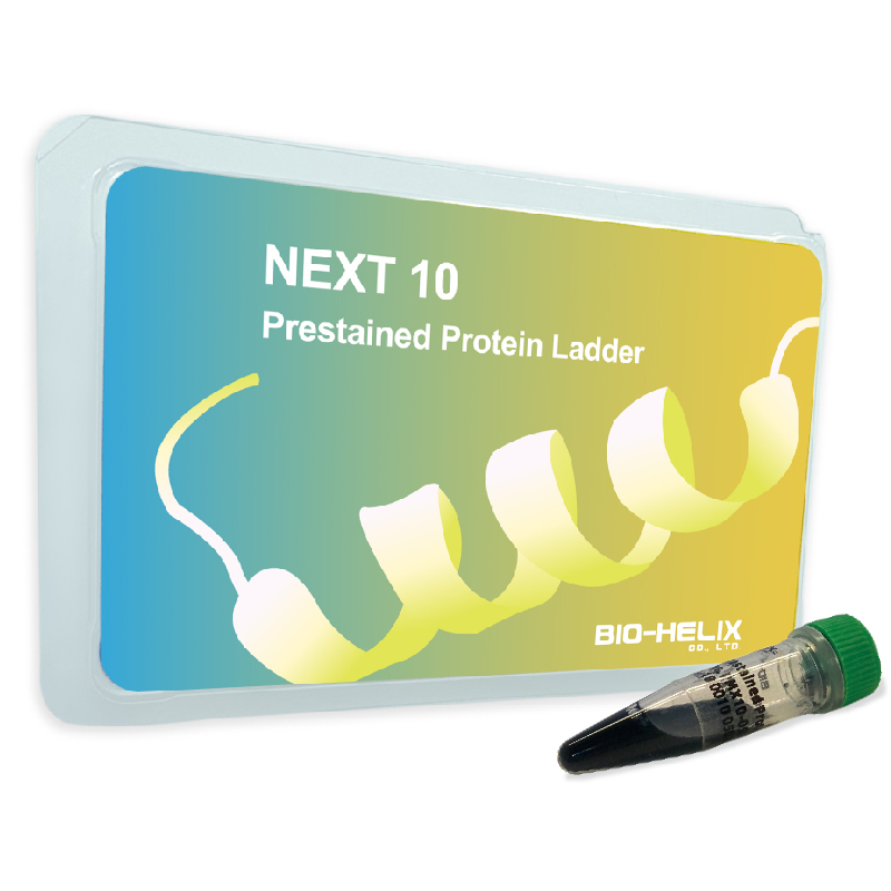 The NEXT 10 Prestained Protein Ladder is a combination of 10 pre-stained proteins with molecular weights from 11 to 180 kDa. The 10 recombinant proteins are covalently coupled with blue chromophore, while a red band at 80 kDa, a green band at 25 kDa, and a newly designed yellow band at 15 kDa serve as reference bands. The NEXT 10 Prestained Protein Ladder keeps track of the size and separation of proteins during SDS-polyacrylamide gel electrophoresis, approximating the target protein size and validating the Western transfer efficiency on PVDF, nylon, or nitrocellulose membranes.